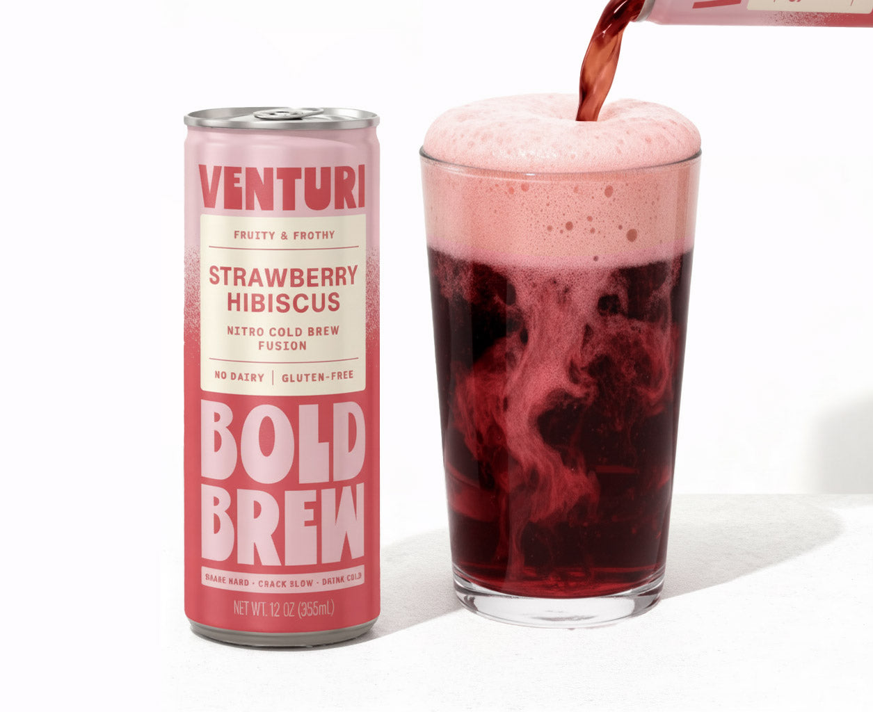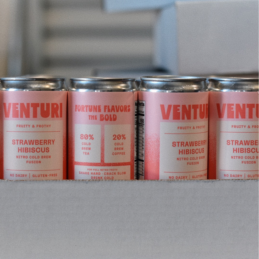 Venturi’s Strawberry Hibiscus is a refreshing nitro cold brew fusion that blends juicy strawberries, hibiscus-steeped tea, and creamy nitro-infused cold brew. Crafted with an 80/20 hibiscus tea + blonde roast blend, it delivers bright, subtly sweet flavor upfront with shockingly smooth depth beneath the surface — a clean, natural energy designed to carry your momentum from first light to last call.